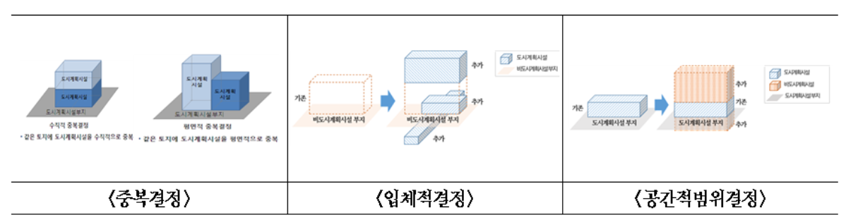 - 공간적범위결정 : 도시계획시설로 기 결정된 부지에 도시계획시설이 아닌 건축물이나 공작물을 허용하기 위하여 기존 도시계획시설의 일정한 공간적 범위를 결정(ex. 구의유수지의 경우 공공주택 도입을 위하여 공간적 범위 결정 등)